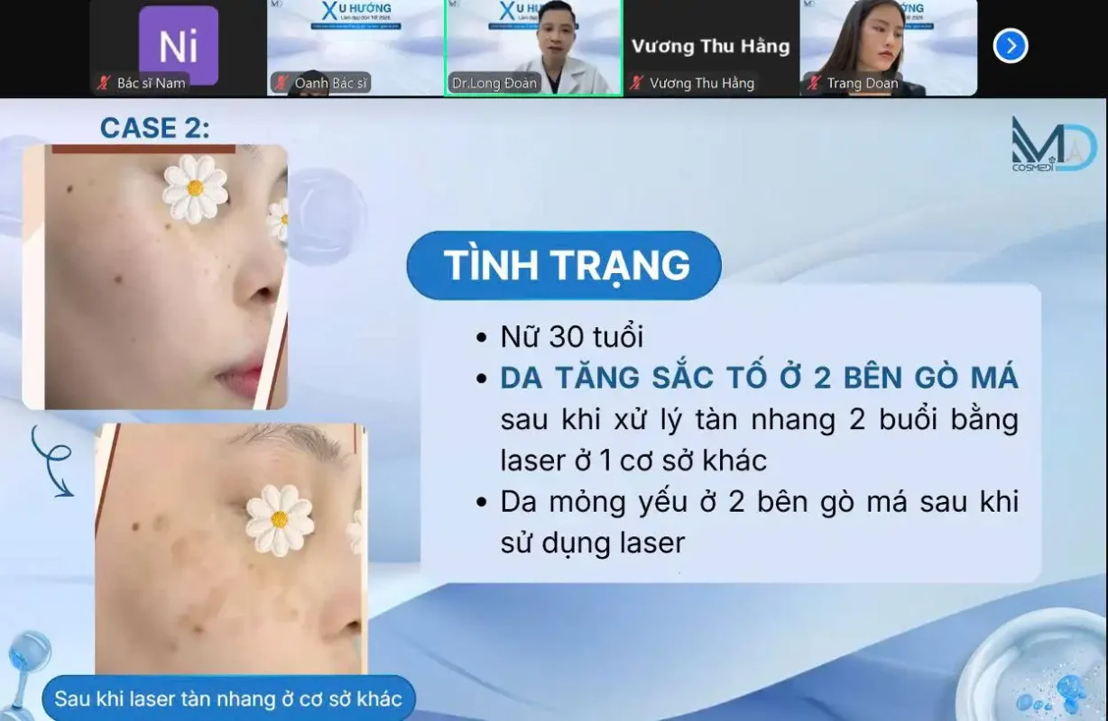 Trong phần chia sẻ của mình, chị Trang Đoàn đã trình bày chi tiết một ca da khó: khách hàng có tiền sử dụng kem nén chứa corticoid trong thời gian dài, dẫn đến nền móng móng yếu, lão hóa sớm, kèm theo nám mảng và chậm lan tỏa. Trước khi đến điều trị, khách hàng đã thử qua nhiều thương hiệu khác nhau nhưng đều gặp tình trạng kích ứng.