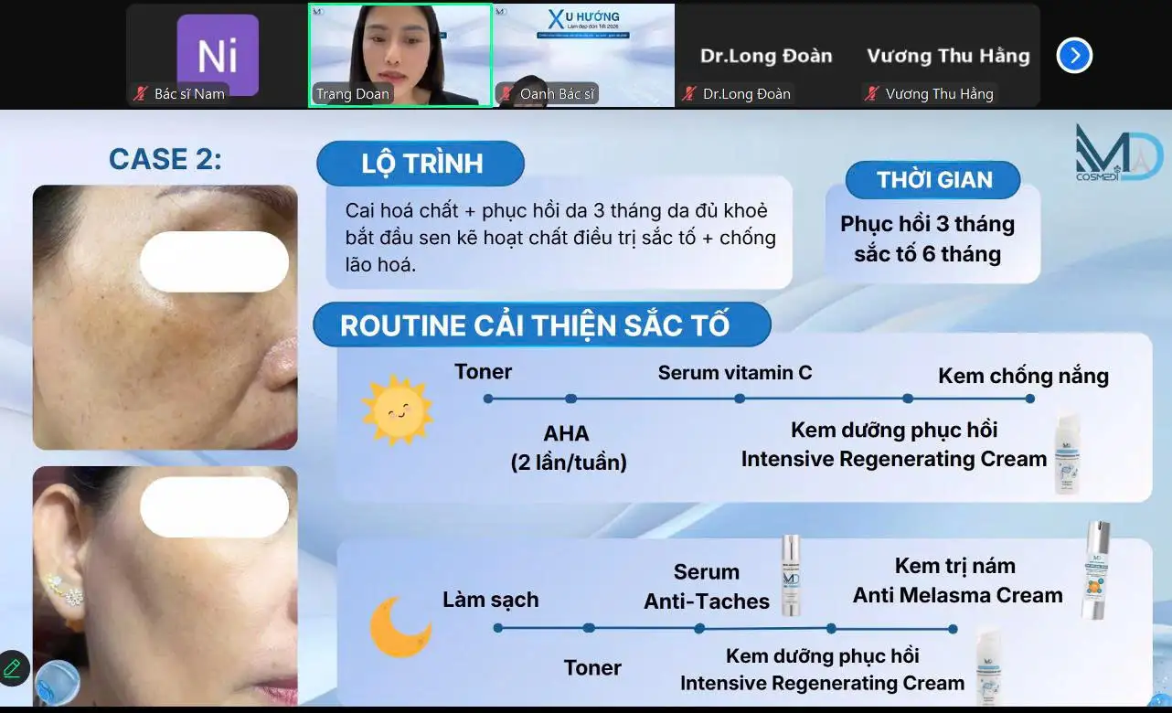 Không dừng lại ở công việc chia sẻ phác đồ, workshop nhưng vẫn mang đến góc nhìn mong đợi xu hướng làm việc tốt đẹp vào năm 2026, đặc biệt là dịch chuyển sang các chương trình sinh học, kiểm tra Kiểm soát sắc tố theo cơ bền vững, giảm phát thải thay vì có thể mạnh và ngắn hạn. Phương pháp Nanovectore Cysteamine được nhấn mạnh như một xu hướng được nhiều lựa chọn ưu tiên hàng đầu trong điều trị nám và tăng sắc tố phức hợp.